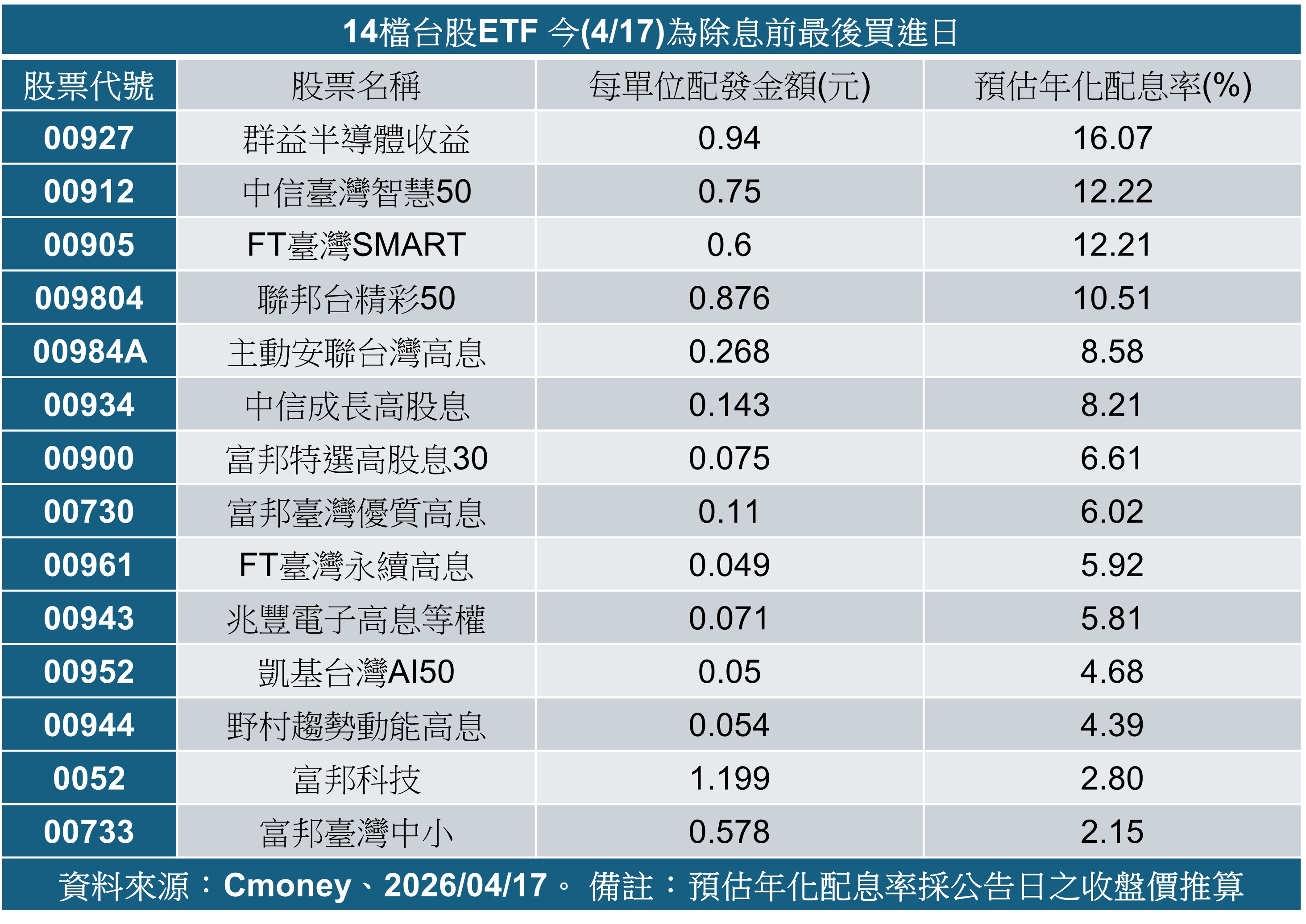 包含00927群益半導體收益在內的14檔台股ETF,即將除息,想領息的最後買進日只剩今(17)日。