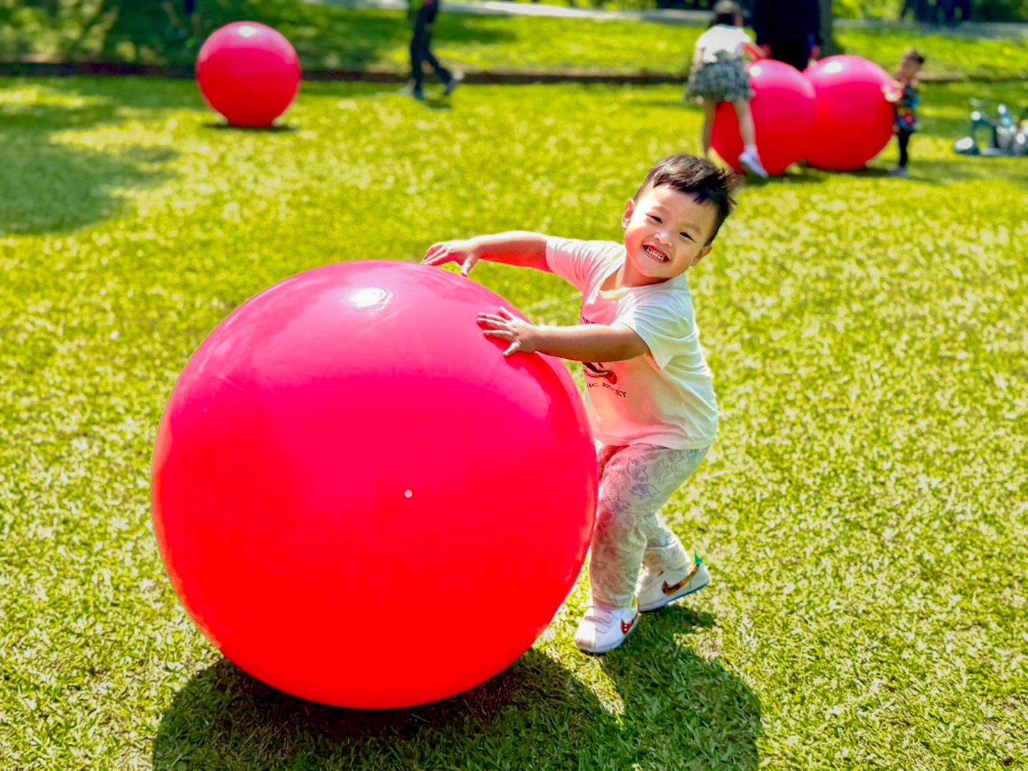 ↑圖說:孩童開心地推動「紅咚咚」巨型紅球,在草地上盡情奔跑玩耍。(圖片來源:高雄市觀光局提供)