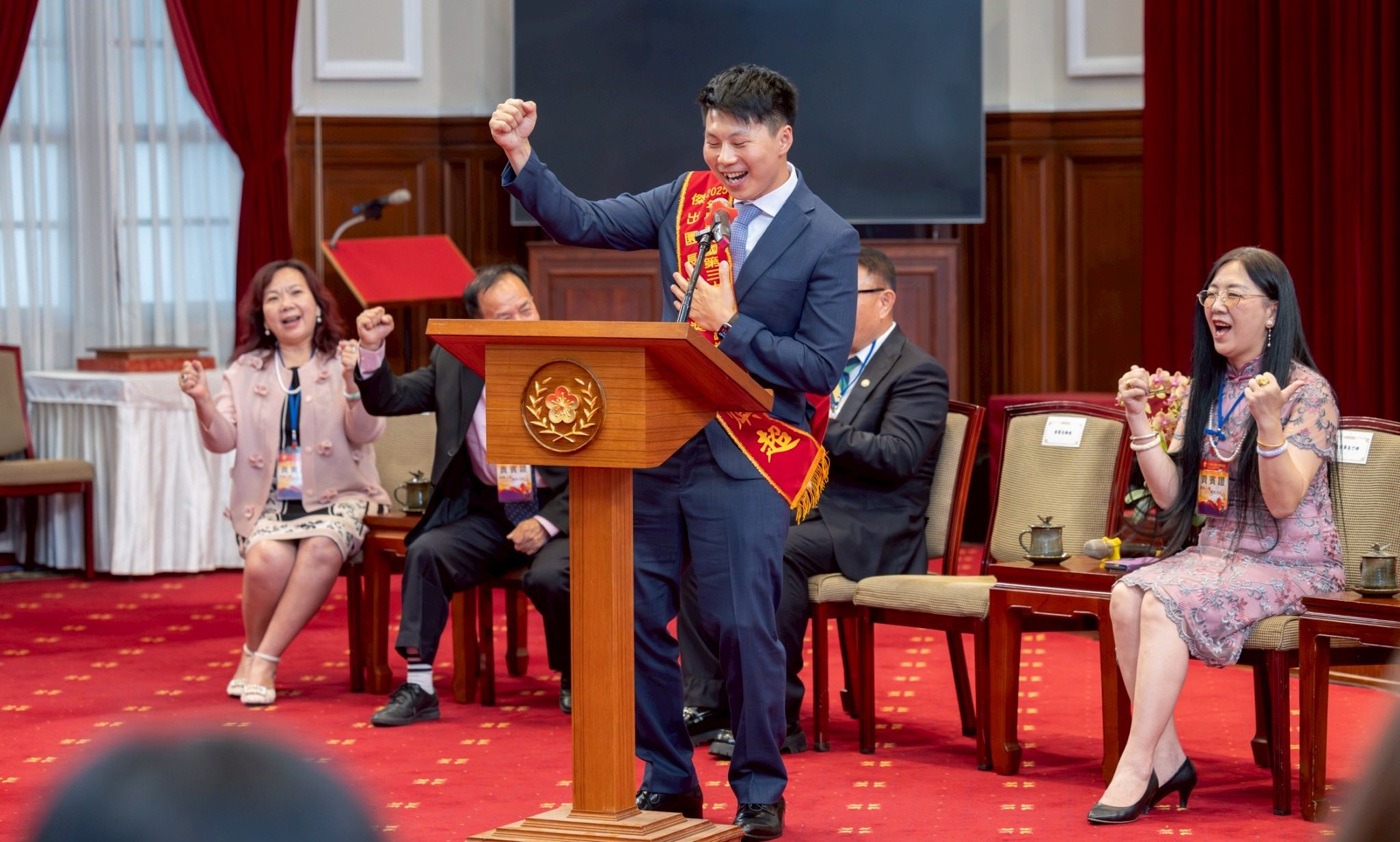 ↑圖說:黃煥超於總統府代表得獎者發表演說,分享投身幼教16年的心路歷程與教育信念。(圖片來源:樹德科技大學提供)
