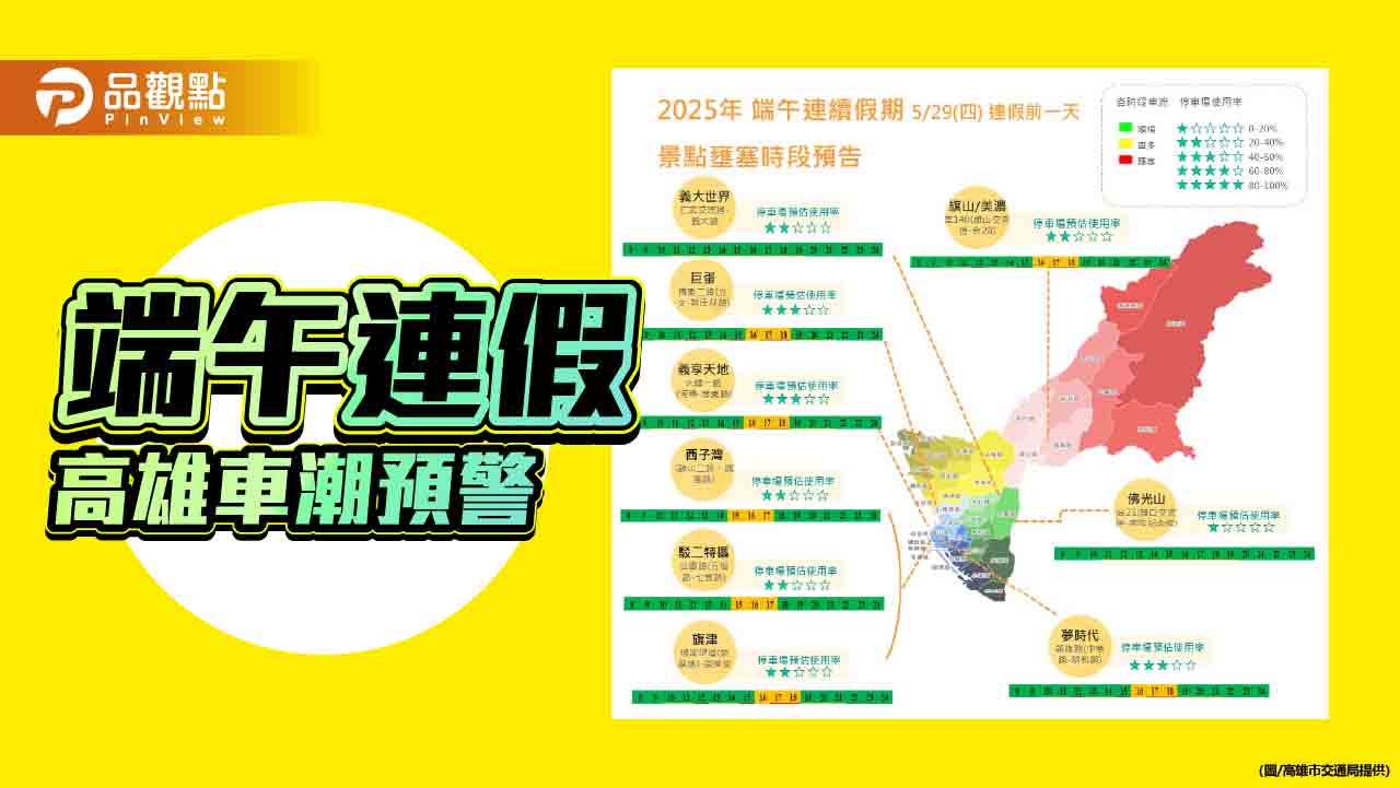 端午節連續假期共計3天(5月30日至6月1日)將有一波出遊車潮,高雄市交通局智慧運輸中心依據歷史數據,分析並整理高雄市區主要幹道、景區車流狀況進行預測,預期整體車流量將較一般假日增加約8.2%。