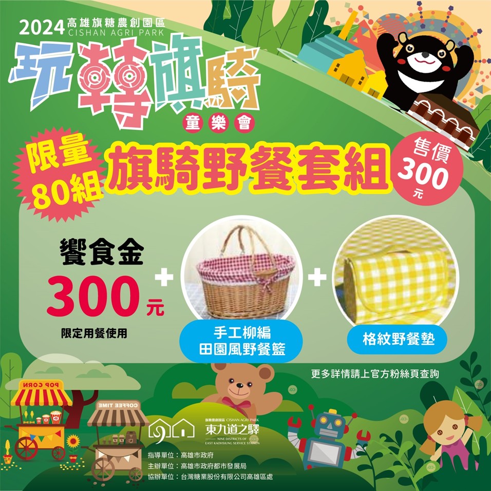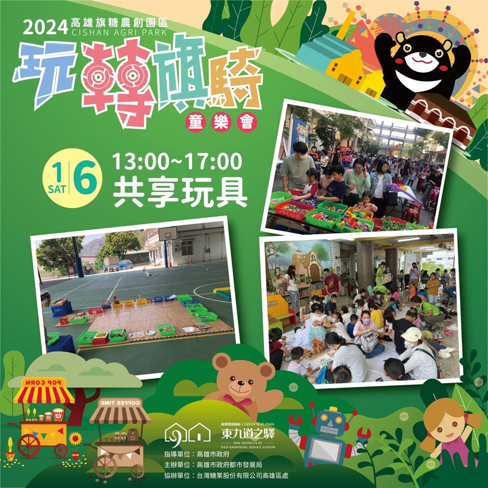 為響應環境永續,高雄市都市發展局與台灣玩具圖書館協會合作,以玩具共享全齡共玩為主題,將於1/6在東九道之驛-旗糖農創園區舉辦「玩轉騎旗童樂會」,內容包括共享玩具體驗、滑步車體驗、美食饗宴及表演節目,而且活動當天主辦單位準備1000份小禮物,只要於園區內手機打卡即可兌換,還有限量80組野餐套組每組售價300元,內含手工藤編野餐籃、野餐墊以及300元美食饗宴兌換券,2024年第一個星期假日,就到旗糖來場親子輕旅行。