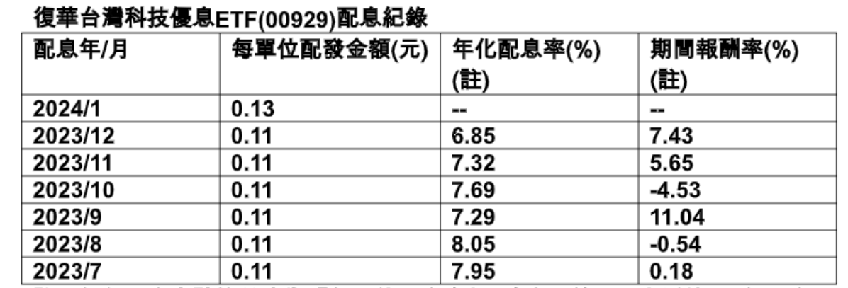 瞭解內情人士分析,00929此次配息金額調高至0.13元,主要來自成分股比重第一大的聯發科(2454)將於本月4日除息,每股擬配發24.6元;前十大的中美晶(5483)25日除息,每股擬配發3.5元,預估將有不少股利進帳,加以去年00929報酬表現突出,以及去(2023)年底進行00929追蹤指數成分股權重調整與優化,使接下來的配息及資本利得表現可期。