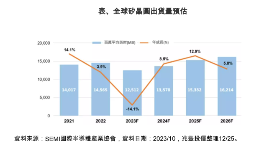 兆豐洲際半導體ETF基金(00911)研究團隊表示,近期半導體庫存調整近尾聲,矽晶圓產業復甦驅動2024年出貨量將出現反彈,預計在人工智慧(AI)、高效能運算(HPC)、5G、汽車、工業應用等需求帶動晶片需求增加,帶動電動車、電動車充電設施等的關鍵元件,追求供應需求量的更大化,有利半導體題材利多續行,有助2024年將可恢復年營收增長8.5%,預估成長動能將延續兩年。