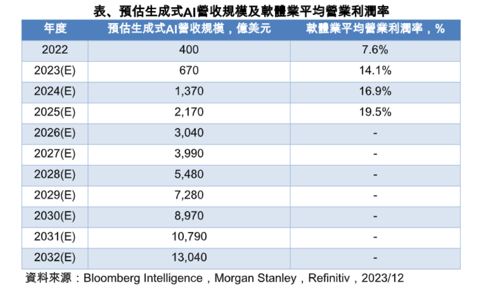 根據Bloomberg Intelligence預估數據顯示,2032年生成式AI相關營收規模預估可達1.3兆美元,至2032年的複合成長率達42%,生成式AI佔總體科技支出比重會由目前低於3%,至2032年提升至12%,其中,帶動軟體開發成長動能影響最大,Morgan Stanley統計,軟體業在這股生成式AI風潮下,平均營業利潤由2022年的7.6%,近三年持續成長趨勢,預估至2025年可望提升至19.5%。