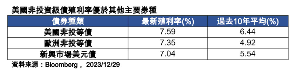 保德信指出,隨聯準會政策轉向,2024年美債殖利率再往上空間不大,加上債市多頭往往來自於收益本身,此時正是掌握降息前夕,債市投資契機的良好時點,而美國非投資級債不論在最新殖利率、平均報酬率等表現,皆優於其他債券,因而率先受到法人資金關注。