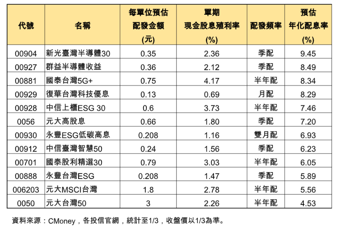整體來看,截至今天為止,已公布配息金額的12檔台股ETF,年化配息率至少4.5%起跳,其中,群益半導體收益(00927)、國泰台灣5G+(00881)、復華台灣科技優息(00929)等3檔,預估年化配息率都超過8%。