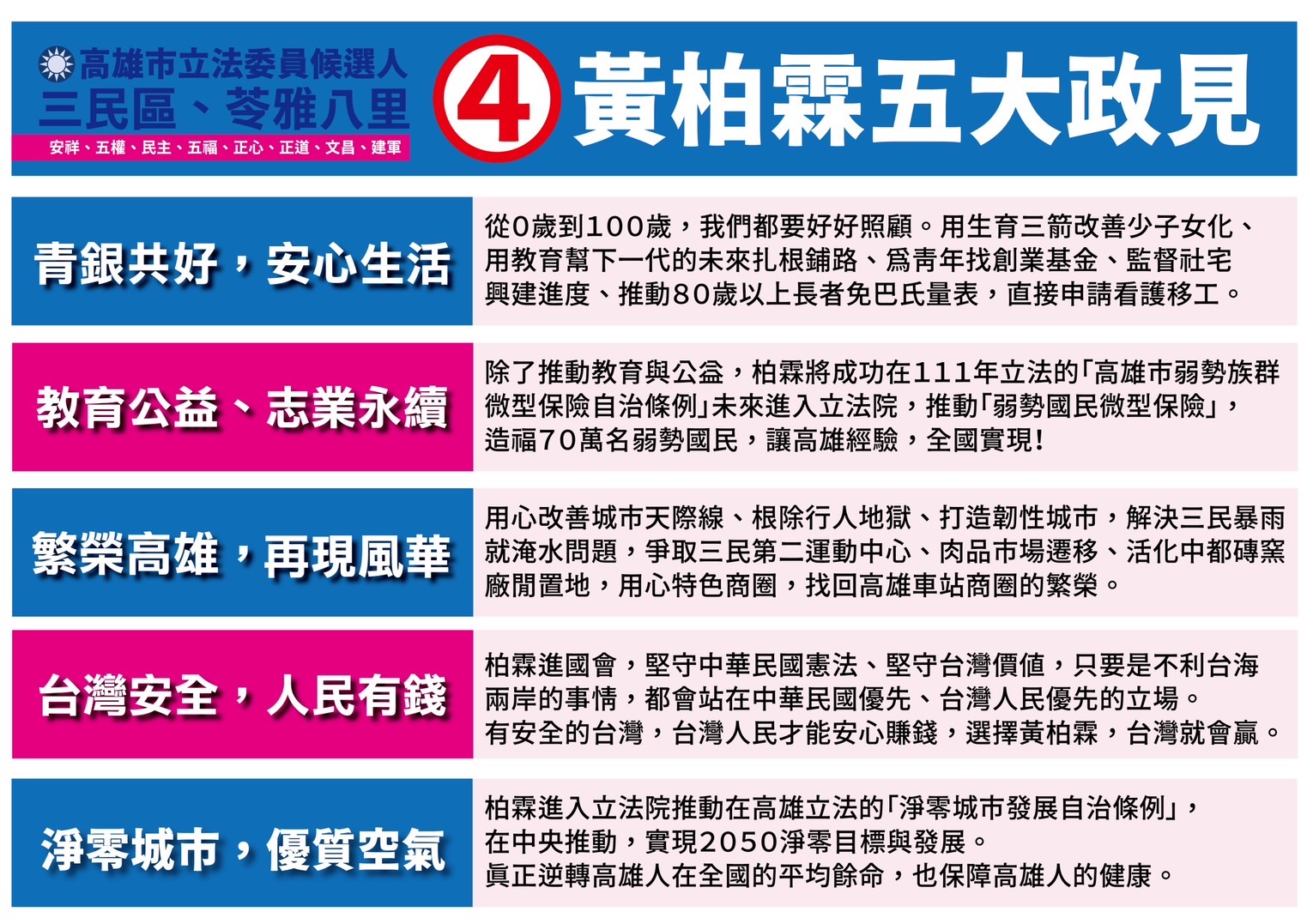 針對這次提出的5大競選政見,黃柏霖說「青銀共好,安心生活」、「教育公益,志業永續」、「繁榮高雄,再現風華」、「台灣安全,人民有錢」、「淨零城市,優質空氣」,也歡迎有興趣的朋友,可以至官網看到詳細政策內容。