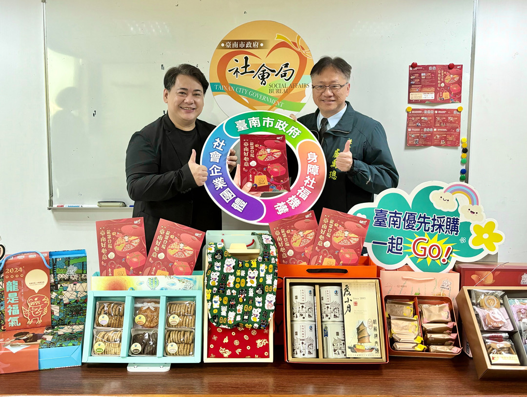 台南市社會局今年聯手5家符合優先採購資格的身心障礙機構團體,包括台南市心智障礙關協會附設展翼烘焙坊、私立天主教瑞復益智中心、喜憨兒社會福利基金會、台灣省私立鴻佳啟能庇護中心、衛服部嘉南療養院等身障機構,共同推廣春節禮盒。市府期望透過鼓勵大眾購買春節禮盒、推廣優先採購產品,以幫助身障機構內的社會弱勢團體。本次春節禮盒促銷活動除了納入市府選物促銷重點外,台南東南扶輪社也贊助限量35盒度小月超彭湃肉燥禮盒作為滿額贈禮。