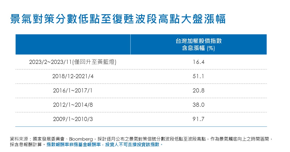 元大投信統計前四次景氣對策分數低點至復甦波段高點,加權股價指數表現強勢,含息報酬介於16%至86.4%,本次景氣對策分數出現於2023年2月,目前僅回升至黃藍燈,隨去庫存接近尾端,企業下單逐漸回溫, AI 產業持續推動拉貨需求下,台股未來表現空間十分值得期待。