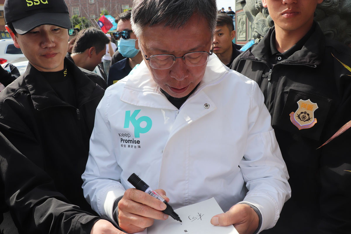 ↑圖說:柯文哲幫支持者簽書 (圖片來源:記者謝欣澤拍攝)