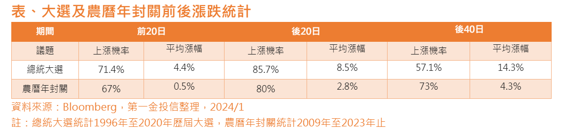 從過往總統大選與農曆年封關前後20日、40日的台股表現觀察,台股上漲機率高,選後慶祝行情尤其亮眼,選後20日、40日平均漲幅分別可達8.5%、14.3%水準。