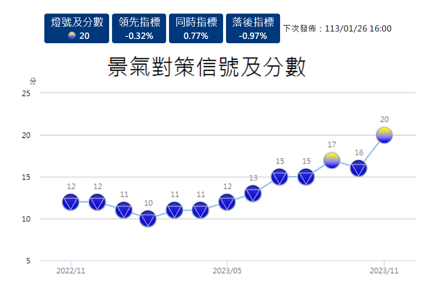 近期台股未跟進外科技股反彈行情,主要面臨選舉不確定性因素干擾,第一金投信分析,11月景氣對策信號再轉黃藍燈,歷次景氣燈號由藍轉黃藍燈,若非外部因素影響,通常在公佈後的3個月後、6個月後皆呈現上漲表現。