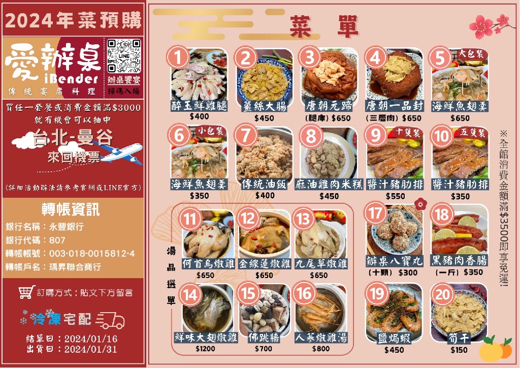 ↑圖說:即日起至1/16止,凡下訂「iBender 愛辦桌」年菜套餐,就有機會抽到「泰國來回機票」。(圖片來源:「iBender 愛辦桌」提供)