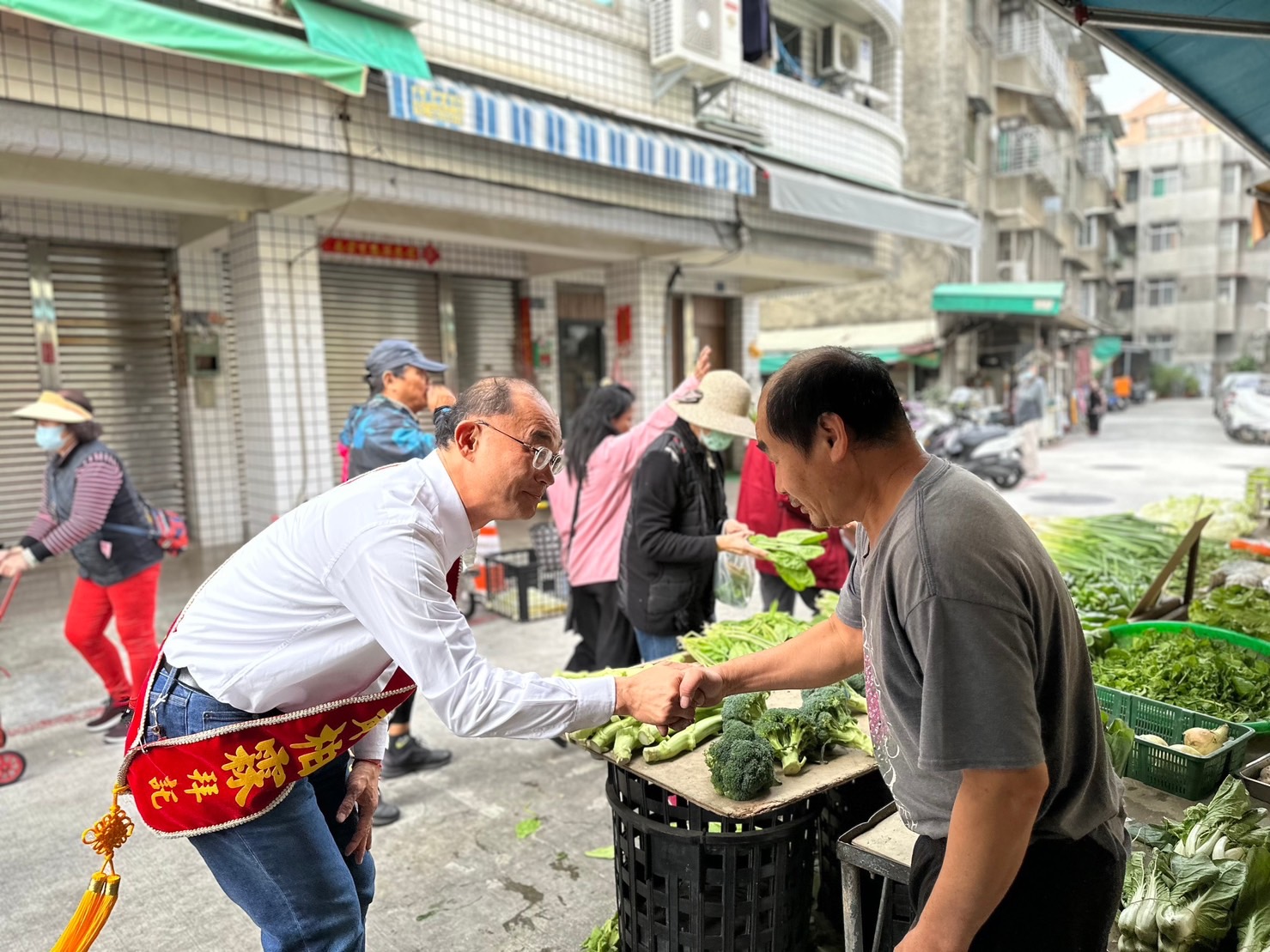 ↑圖:黃柏霖(左)與攤商親切握手。(圖片來源:黃柏霖競總提供)