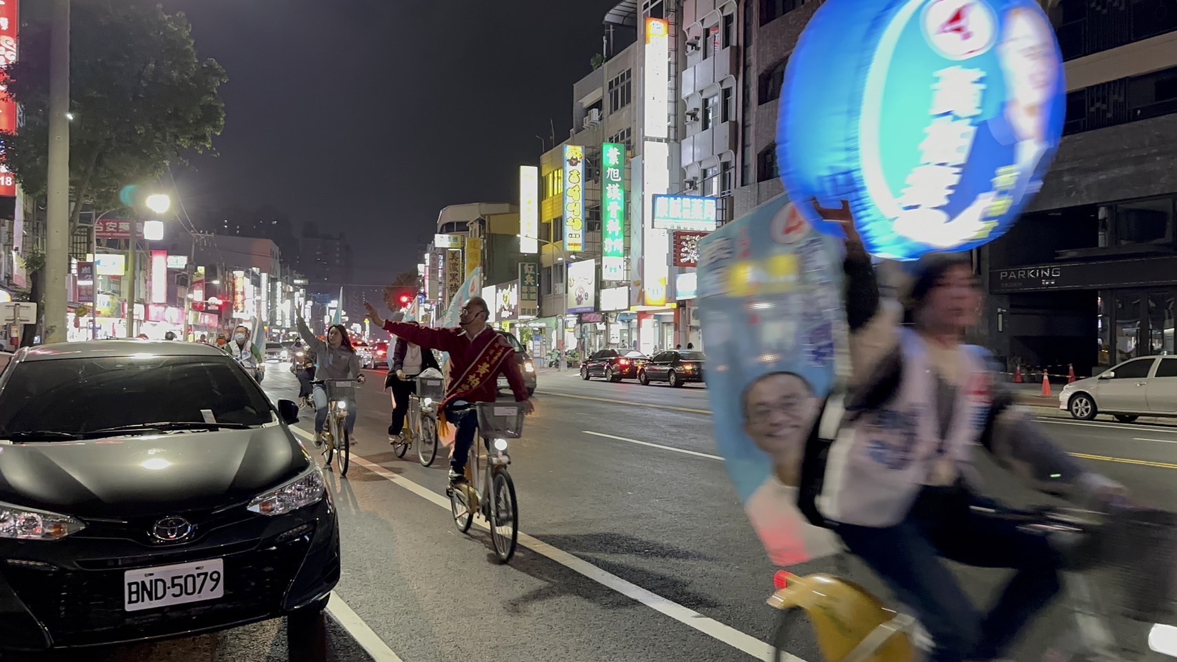 ↑圖說:黃柏霖夜騎自行車展開拜票。(圖片來源:黃柏霖競總提供)