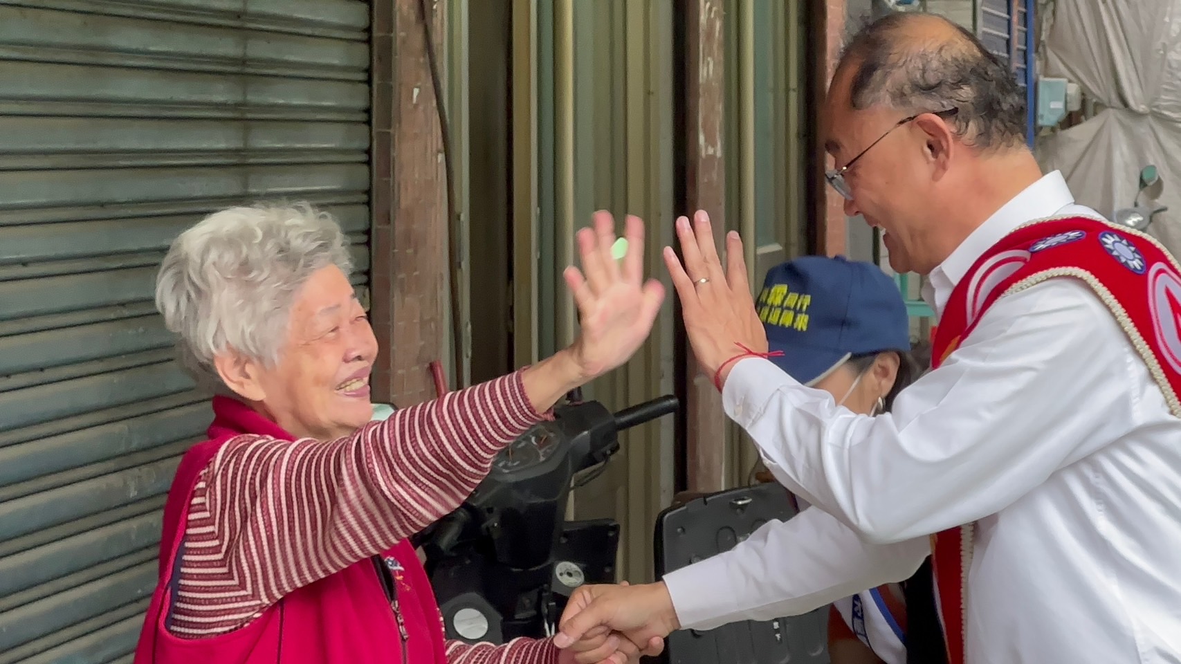 ↑圖說:黃柏霖(右)與長輩握手又擊掌。(圖片來源:黃柏霖競總提供)