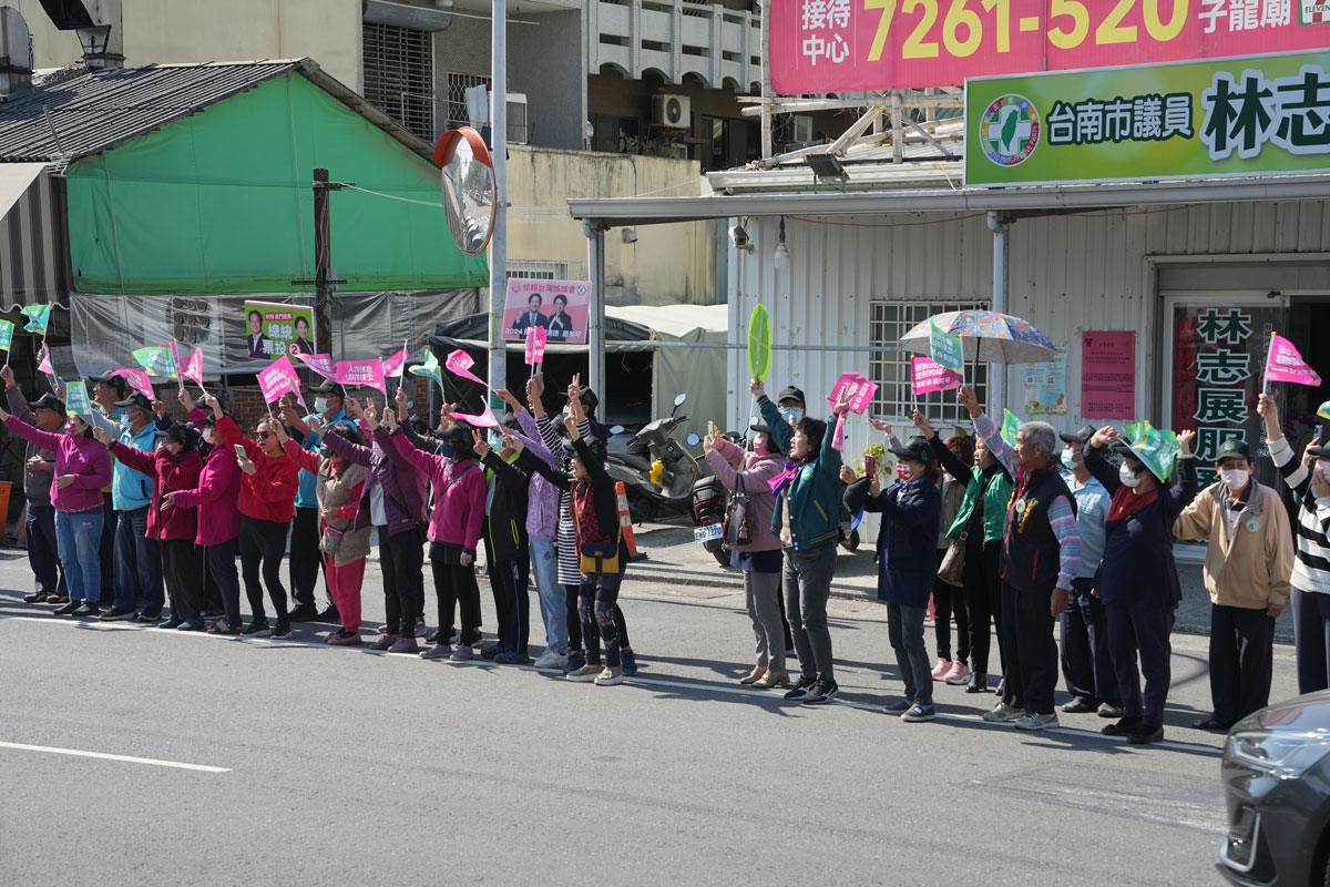 民進黨副總統候選人蕭美琴今回到台南,陪同台南立委候選人賴惠員以及郭國文掃街拜票。蕭美琴第一站前往新營為賴惠員站台,僅隔半小時就前往第二站善化陪同郭國文掃街。蕭美琴與郭國文掃街行程雖只安排半小時,一路上仍聚集支持者搖旗吶喊。