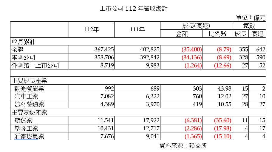證交所完成上市公司(含創新板公司)2023年營收統計,累計達36兆7425億元,較2022年衰退3兆5400億元(-8.79%),營收成長公司共355家,衰退公司共642家。以產業來看,觀光餐旅業、汽車、建材營造業成長最大;衰退較大的產業則包括航運、塑膠、油電燃氣業。