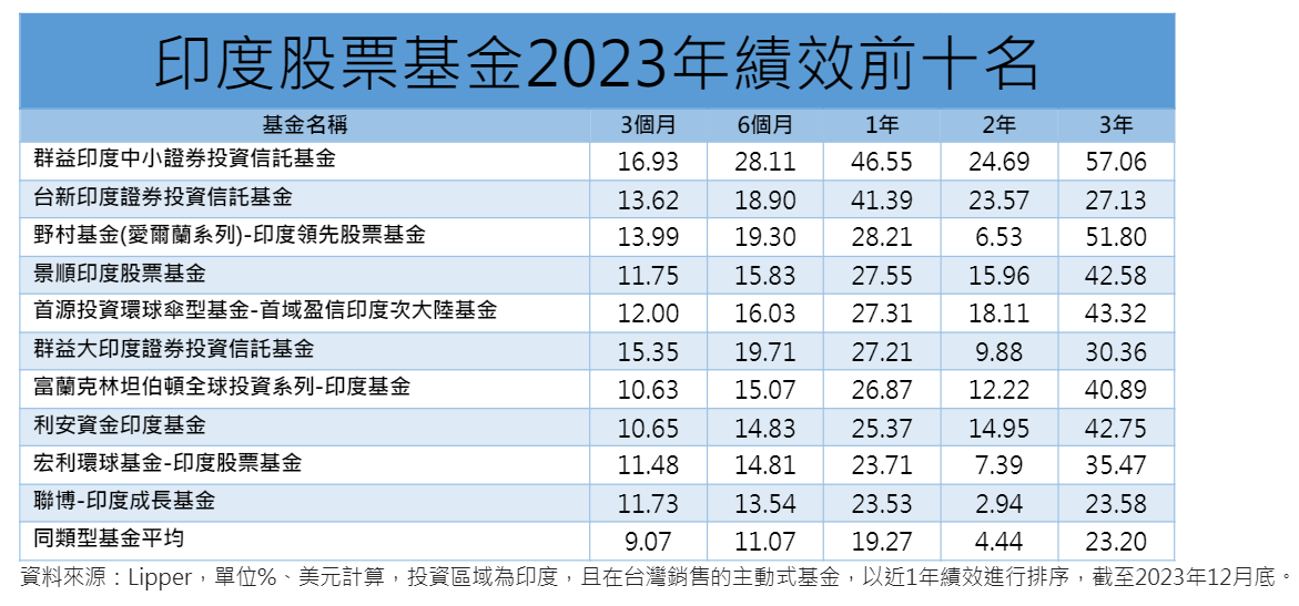 印度股市去年走勢強勁,屢次改寫歷史新高,檢視印度基金2023年績效,前10名漲幅23%起跳,前2名甚至超過4成,表現亮眼。展望後市,去年績效冠軍:群益印度中小基金經理人林光佑,仍持續看好今年印度股市表現;中租基金平台總經理蘇皓毅也認為,印度的高經濟成長動能、人口紅利、印度製造等三大優勢,成為外資新熱點,有望迎來黃金十年榮景,投資人宜儘早定期定額或單筆分批布局印度基金。