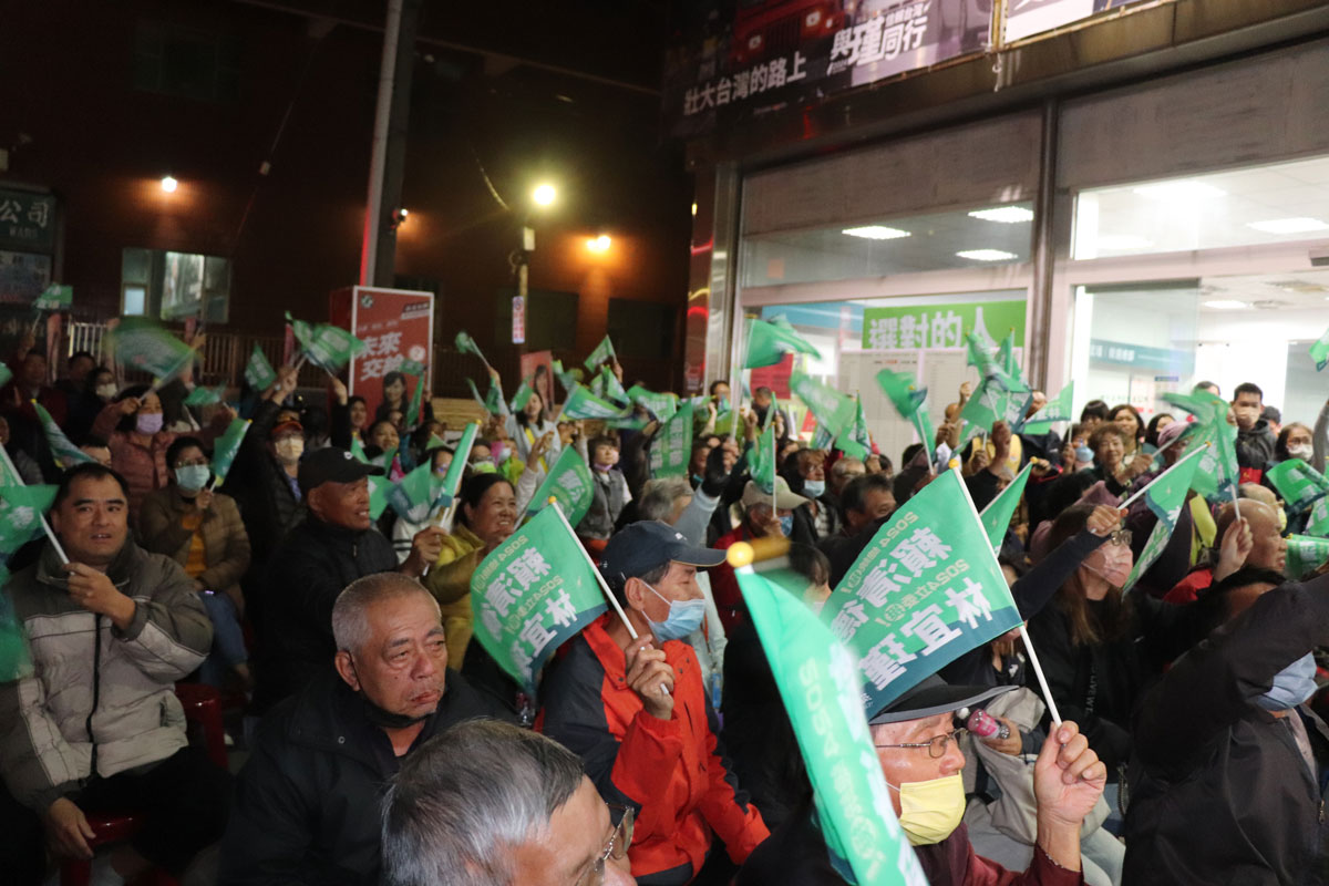 ↑圖說:民進黨林宜瑾支持者在聽到當選訊息後,搖旗聲援。(圖片來源:記者謝欣澤拍攝)