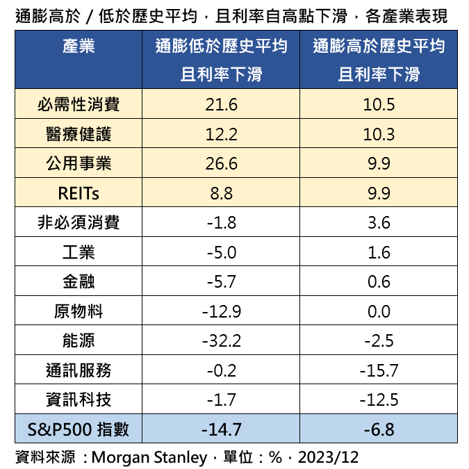 PGIM保德信全球醫療生化基金經理人江宜虔表示,這波全球通膨快速上揚,推高通膨數據高於歷史平均,從統計可得知,在高通膨且利率走緩期間,以必需性消費、醫療健護平均漲幅達雙位數,更大幅勝過同期S&P 500指數的負報酬,目前美國利率處於從高點可能逐漸下降的循環,近期通膨數據亦逐漸和緩,強化市場對降息的預期,同時提高醫療產業股價表現優於整體股市的機率。