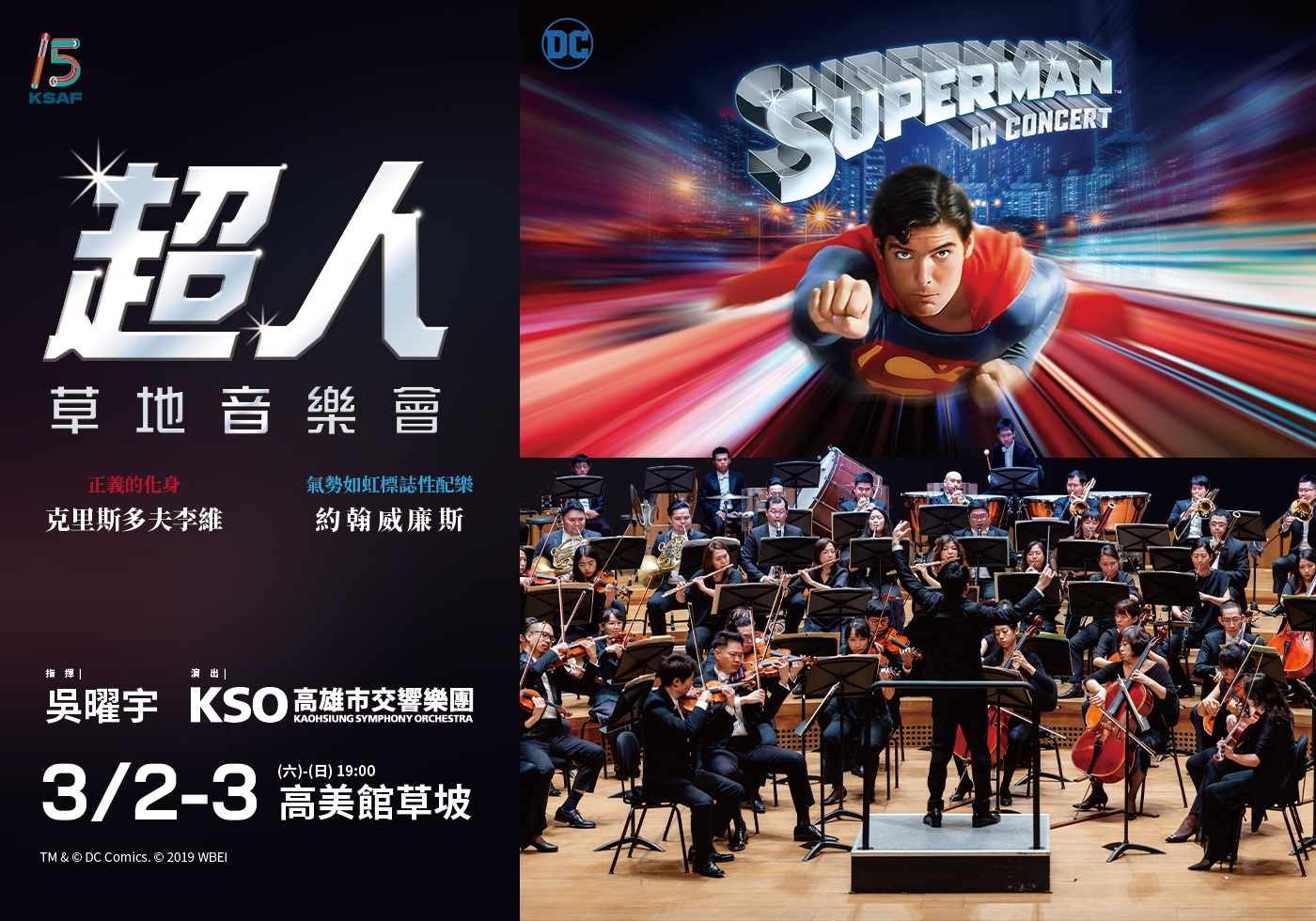 3月2、3日連續六日晚上7點,《超人》草地音樂會將於高美館草坡舉行,由曾獲得法國貝桑頌國際指揮大賽中首獎、樂團大獎及觀眾大獎得主--指揮吳曜宇率領高雄市交響樂團鉅獻零秒差生動配樂,他熱情優雅、富感染力的指揮風格獲各方高度評價,被視為年輕一代最具希望的指揮家;相信在他的領軍之下,必能帶領觀眾來一場視覺及聽覺的雙重饗宴,重溫當初電影所帶來的感動及震撼,在悠揚的樂聲中,跟著身著紅色披風得超人,進入充滿科幻及超能力的英雄宇宙。