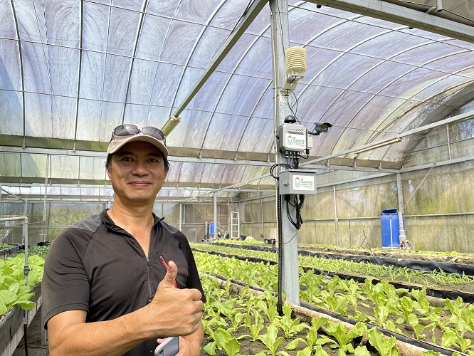 旗山區思原生態農場場主羅條原說,農場以「魚菜共生、循環經濟」的概念經營場域,土壤溫濕度及電導度就是維持蔬菜良好生長環境的必要條件,在導入設施後,可從遠端監控田間土壤狀況適時給予灌溉,且可透過土壤電導度值的回饋來做為施肥參考依據,可精準掌握田間施作時機。另智慧服務方面,美濃區農會採收前農會都會派遣專員至契作戶田區抽樣做農藥殘留檢測,以往尚未導入系統時農民都需要透過電話聯繫農會方能得知採檢結果,農會需全天候機並查詢告知農民檢測結果,費時費人力,如今農民可以掃描位於契作田區指示牌上的QR code即可得知藥檢結果,可節省人力更增加事務處理效率。此外,透過掃碼也可以登記施肥、用藥等栽培管理紀錄,針對產銷履歷紀錄作業,大有幫助。