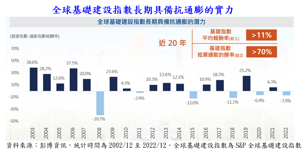 另外,陳美君指出,2018中美貿易戰開打後,歐美企業將生產基地移回各自配合的工廠生產,因此生產成本墊高、物價跟著上漲,低通膨的時代過去了,基礎建設產業通常具有政府的定價能力,全球基建指數因此具有長期抗通膨的能力。