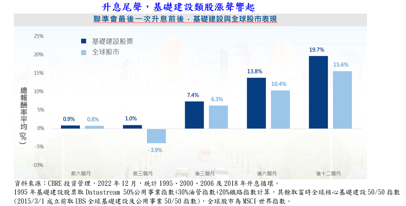 現在是投資基礎建設的好時機嗎?陳美君分析,統計過去四次的升息循環前後,全球基建指數經歷升息循環,期間無論前三個月、六個月,基礎建設股票都是正報酬;至於後三個月、六個月甚至是升息結束後一年,基礎建設股票分別有7.4%、13.8%以及19.7%的平均報酬表現,相對優於全球股市指數,可見基礎建設類股相當適合現階進場低接。
