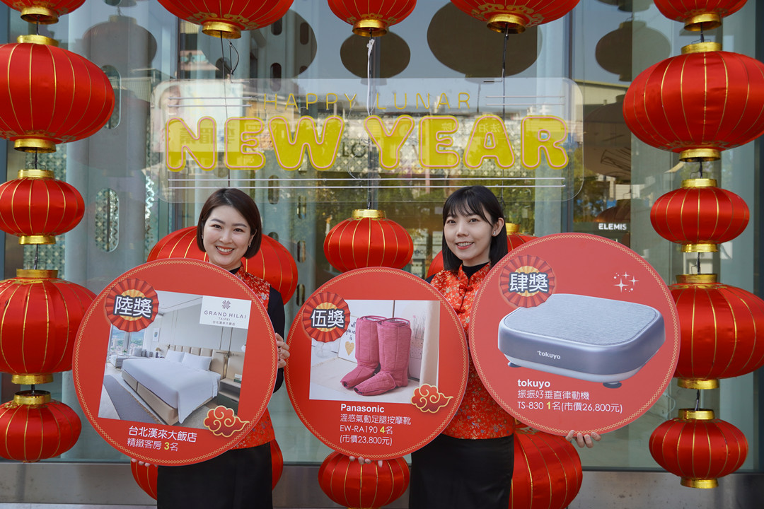 而大年初一2/10(六)「好運龍來新春購」活動當天僅販售人人可享福氣袋,現場共限量2,000份,每人限購2份,購買前300名加碼贈送新春好運刮刮樂乙張,讓民眾財運再加倍,開運接龍不間斷!大年初一當日10:30福氣袋開賣;11:30截止排隊購買;12:30進行開獎,今年除了特獎黃金大禮包外,同時也祭出市價超過13萬SUZUKI GSX R150 ABS最暢銷的白牌打檔車,還有市價近6萬元蘇菲亞寵愛30分鑽戒,以及tokuyo振振好垂直律動機、Panasonic 溫感氣動足腿按摩靴,也有台北漢來大飯店高級住宿券等超豐富好禮等著民眾來試手氣。