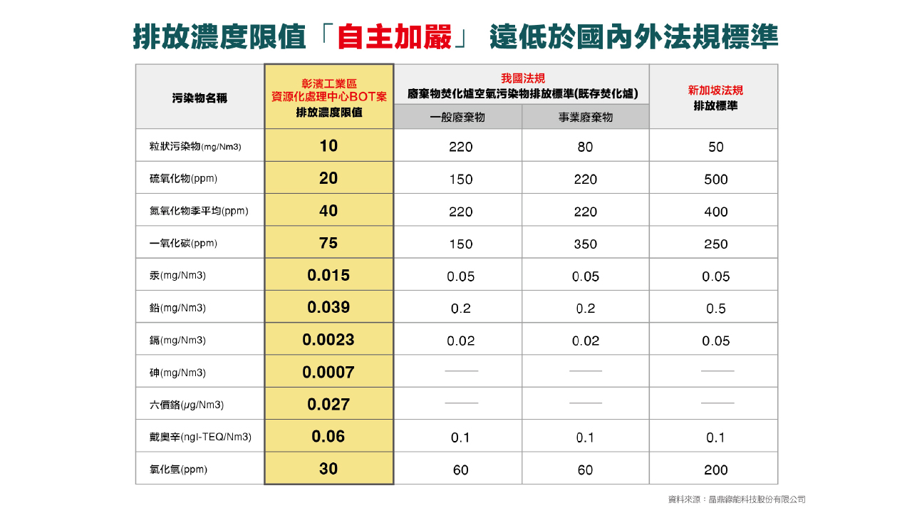 根據規劃,彰濱工業區資源化處理中心佔地4.88公頃,其煙氣處理系統採多段式廢氣處理系統,降低空污排放,同時將鄰近區域之焚化爐排放量納入進行加成影響評估,透過先進處理設備,減少整體環境空污物排放量、降低健康風險疑慮。也承諾執行排放抵換措施,與設置24小時自動監測設施,政府與民眾隨時掌握煙囪排放情形。