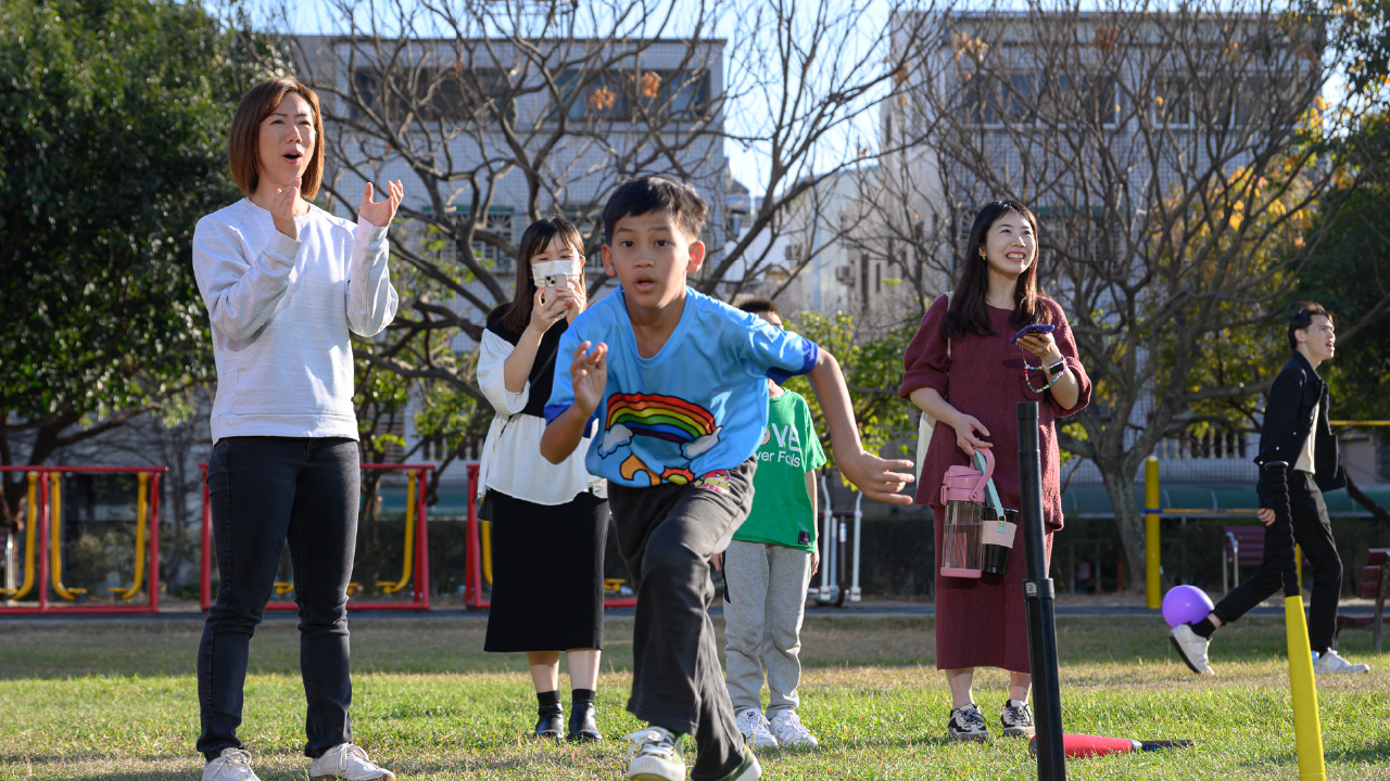 ↑圖說:郭曉玲與張育成陪伴沐風學童課輔班孩子打棒球。(圖片來源:永齡基金會提供)
