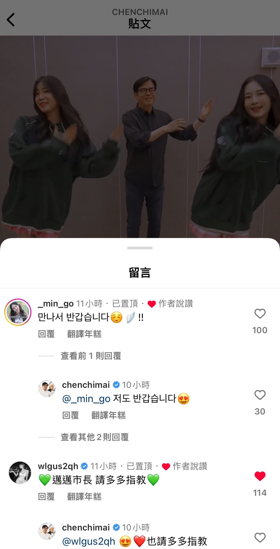 ↑圖說:韓國「最強外掛」安芝儇、「清純精靈」朴旻曙於高雄市長陳其邁IG留言「