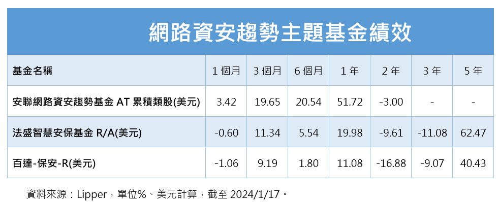 中租基金平台整理台灣核備基金當中,強調布局網路資安趨勢的基金共有三檔,包含「安聯網路資安趨勢基金」有九成以上投資於美國,以資訊科技類股為主;「百達-保安基金」八成五以上布局美國、少部分配置於歐洲、新興市場,產業聚焦資訊安全、保安服務、保安設施等;「法盛智慧安保基金」布局以美國為主的成熟國家,除了35%配置於數位安全外,另外六成布局在實體安全領域,涵蓋物聯網、消費、飲食、運輸、居住、工作等多元產業標的。