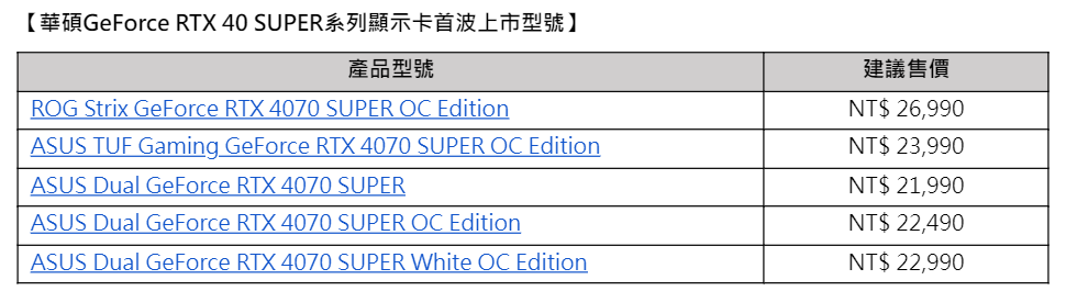 此外,華碩日前也推出GeForce RTX 4080 SUPER、RTX 4070 Ti SUPER與RTX 4070 SUPER顯示卡,產品涵蓋ROG、TUF Gaming、ProArt、Dual四大系列。