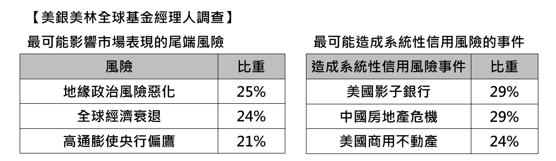 就風險面而言,本月地緣政治風險惡化躍升為經理人最關注的尾端風險,全球經濟衰退居次,而美國影子銀行在本月取代中國房地產危機成為最可能的信用風險事件。
