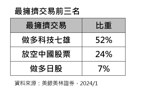 就交易面而言,做多科技七雄為最擁擠交易,其次為放空中國股票與做多日股。
