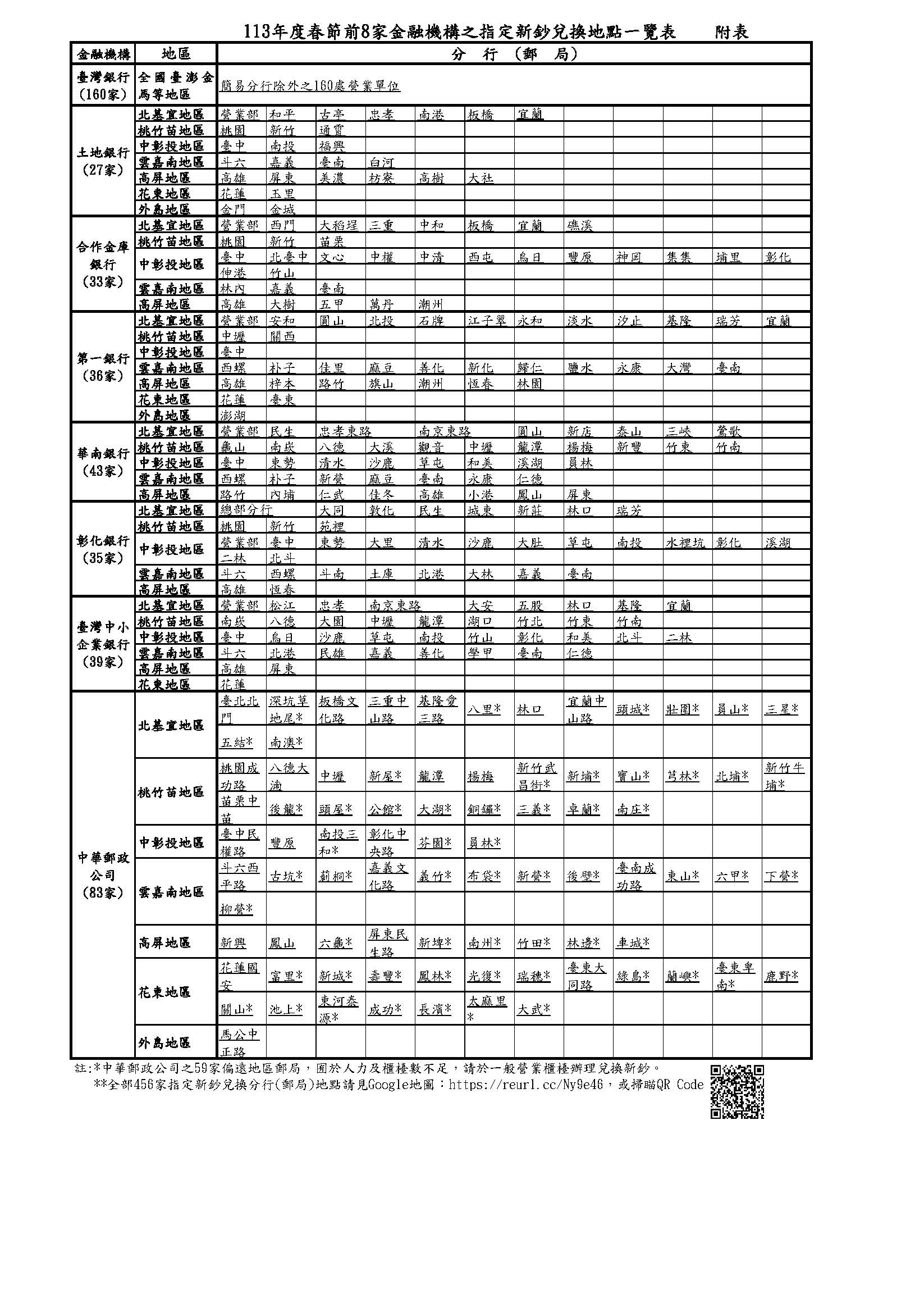 上述7家銀行之373家指定兌鈔分行,以及中華郵政公司位於都會區之24家指定兌鈔郵局,均將開設「新鈔兌換專櫃」,以加強服務民眾;另59家偏遠地區郵局,則於一般營業櫃檯辦理兌換新鈔。