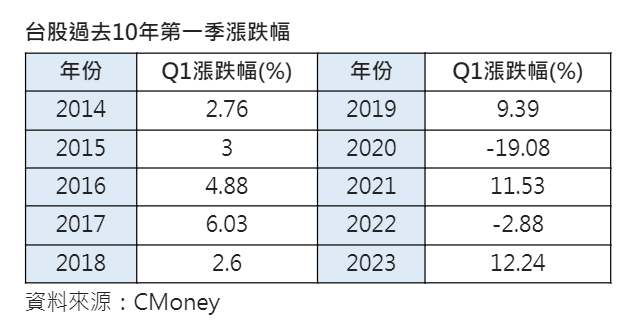台積電法說會釋出的展望,超乎市場預期,股價應聲大漲,也成為台股救世主,法人也因此把目光聚焦在近期募集登場的半導體法說會,包括1/31登場的聯發科、2/1的日月光、2/2的創意法說會。另外,統計過去10年以來,台股的第一季表現偏多,平均漲幅超過3%,10年中,共有8年上漲,僅有2020和2022年下跌,第二季也有6個年度續漲,顯示第一季進場勝率高。
