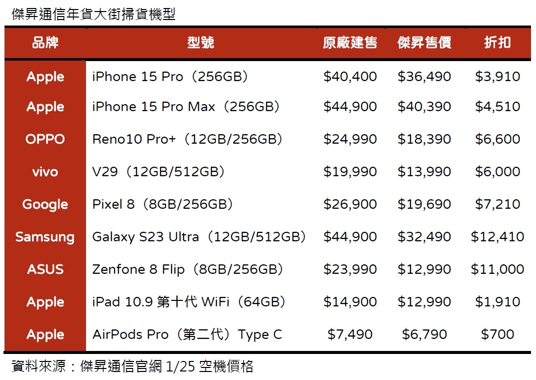 全台最大連鎖通訊門市:傑昇通信,再度推出促銷折扣活動,1月28日前到全台門市開啟新舊機掃貨模式,iPhone 15 Pro直降3910元,iPhone 15 Pro Max(256GB)打9折,一口氣降價4510元;vivo V29只要7折價就能入手,此外,三星AI話題新機Galaxy S24系列,傑昇通信延長預購活動至1月31日,除了原本容量升級買小送大,再加碼配件禮包及竊盜險等好禮,總價值上看4萬。