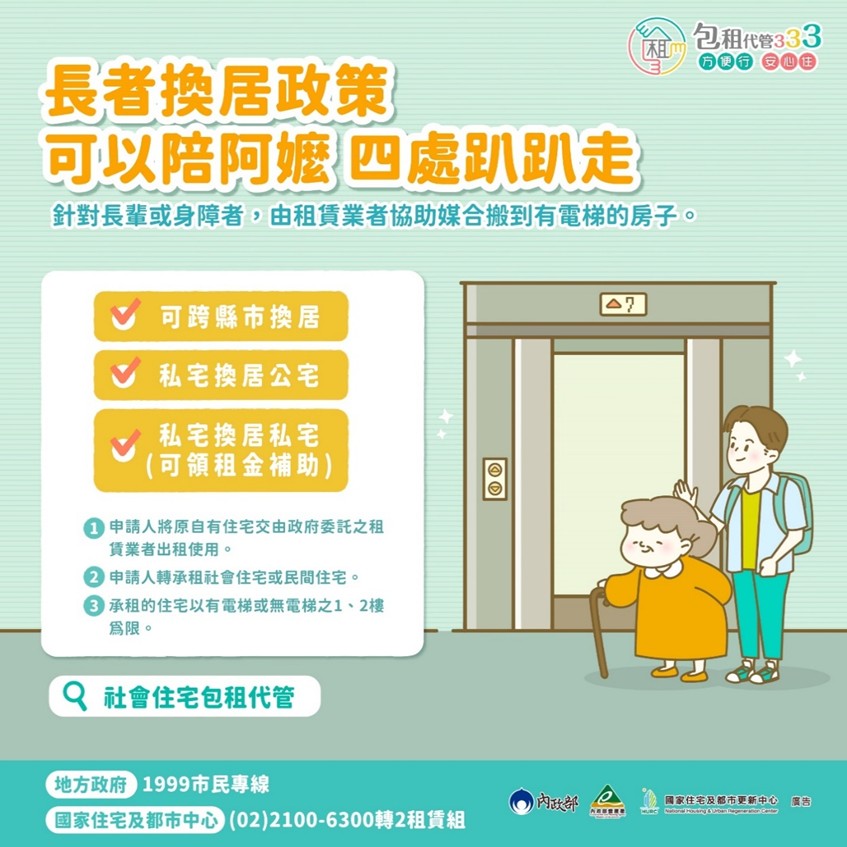 另為因應高齡化社會及協助行動不便之特殊族群,長者或身障者經都發局審查符合入住條件者,可承租符合其居住需求之包租代管社宅,並將其既有住宅出租,讓長者或身障者能居住在更合適的生活空間,原有缺少無障礙設施的房屋,則可以出租讓給需要的房客承租,鼓勵更多年長者房東加入。