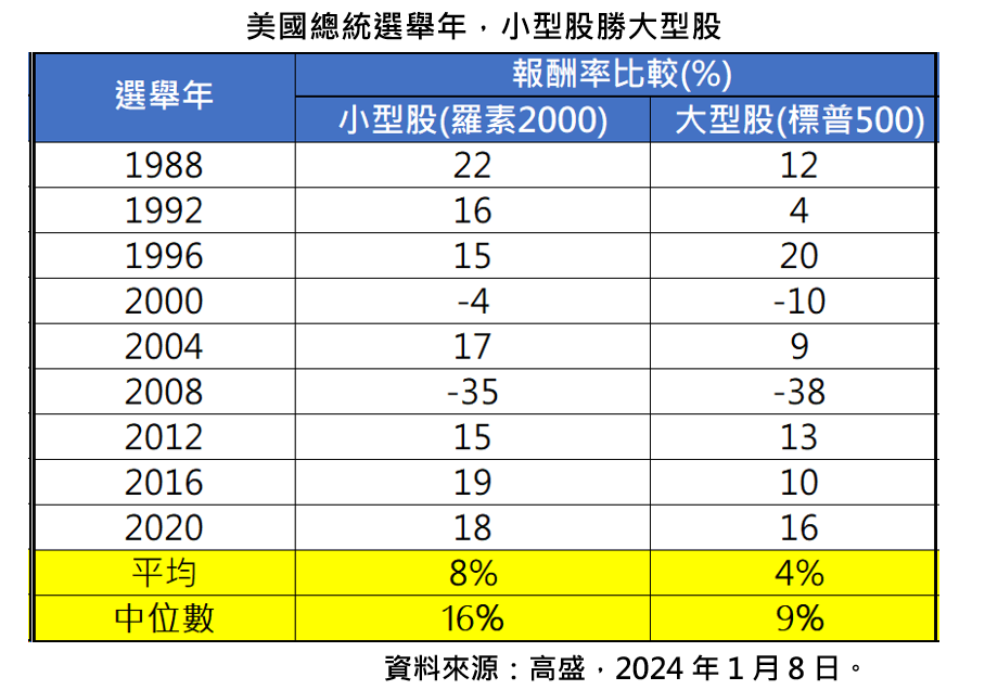 美國總統今年改選,成為投資市場不敢忽視的重要議題之一。投信法人統計1988年以來,美國總統歷次大選,發現小型股表現有8次勝過大型股,中位數漲幅是16%,也勝過大型股的9%。至於今年是否歷史重演,還有待驗證。