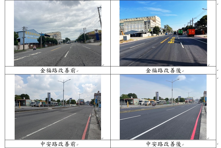 高雄市工務局指出,本次路段改善面積合計約為92,400平方公尺,所改善道路除為貨櫃車行經路線,亦連結高雄國際機場、台17線等重要交通樞紐,同時串聯周邊民生機能,在交通往來流量大與長期重車輾壓下,路面損壞嚴重,採用轉爐石搭配改質瀝青進行刨鋪改善,轉爐石是煉鋼廠轉爐冶煉的附加產物,將其回收再利用於道路鋪築,具有強度高、耐磨損、抗車轍等優點,可大幅提升路面承載力、平坦度,延長道路使用年限、降低維護成本,此外施工過程皆依「瀝青混凝土刨鋪作業手冊」規定辦理,落實施工標準化,提升道路品質。