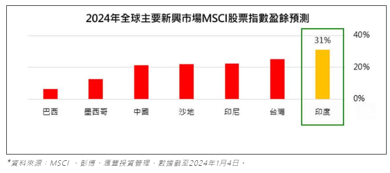 除此之外,印度股市的盈餘成長亦是一大亮點。根據彭博數據顯示,以美元計算,印度股市在2024年盈餘成長將達到31%,亦在新興市場中名列前茅。