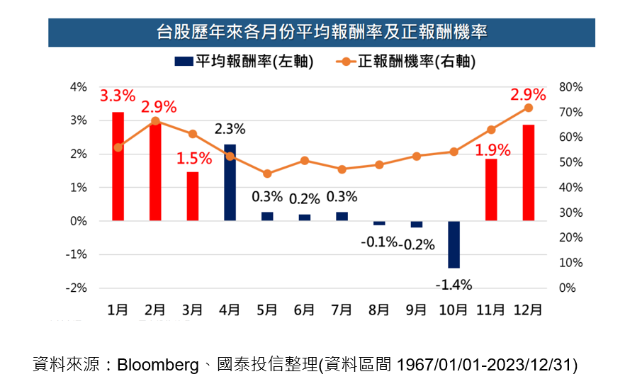 游日傑指出,統計台股過往(1967/1/1-2023/12/31)的11~12 月至隔年 1~2 月,平均報酬率最高,有高機率會出現「紅包行情」,隨著這兩日Fed即將公布最新決策,美股重要財報也將陸續登場,台股應有機會持續站穩萬八,建議投資人定期定額透過台股ETF,把握年後開紅盤,以及2024股債多頭的投資好機會。