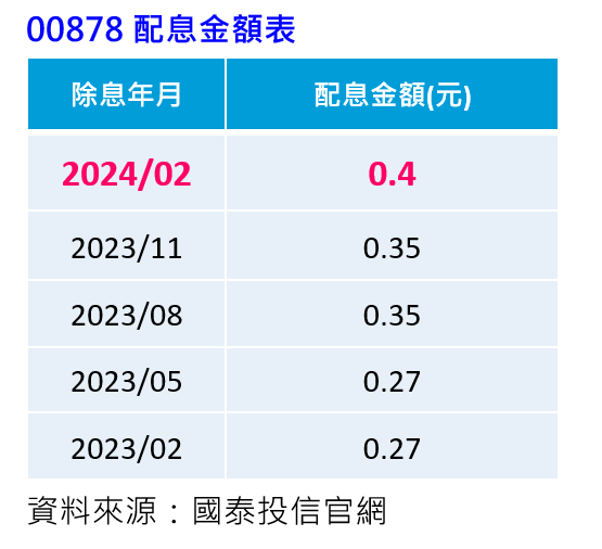 00878以穩定股利配發為目標,2023年報酬率45.41%,且過往配息後均能順利完成填息,今年首季配息再加碼,每單位初估配息0.4元,至於最終的配息金額,將以2月23日公告為準。