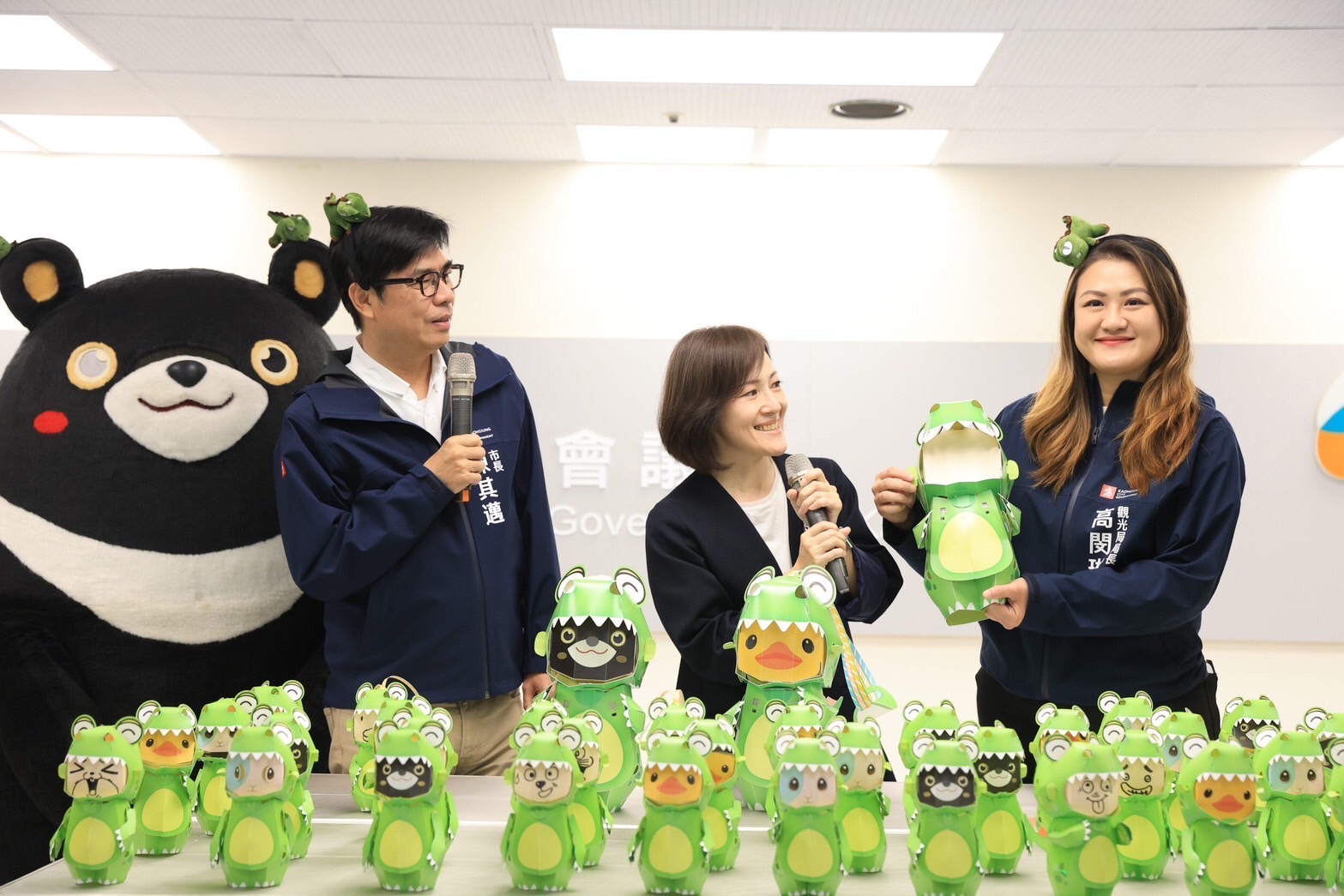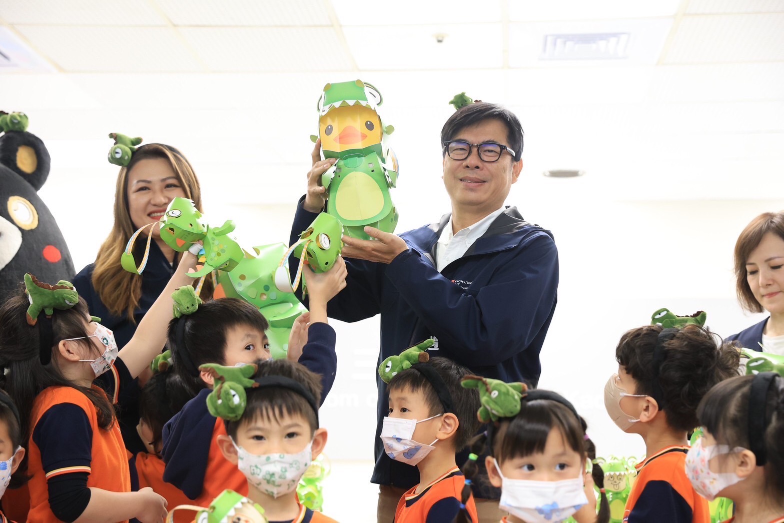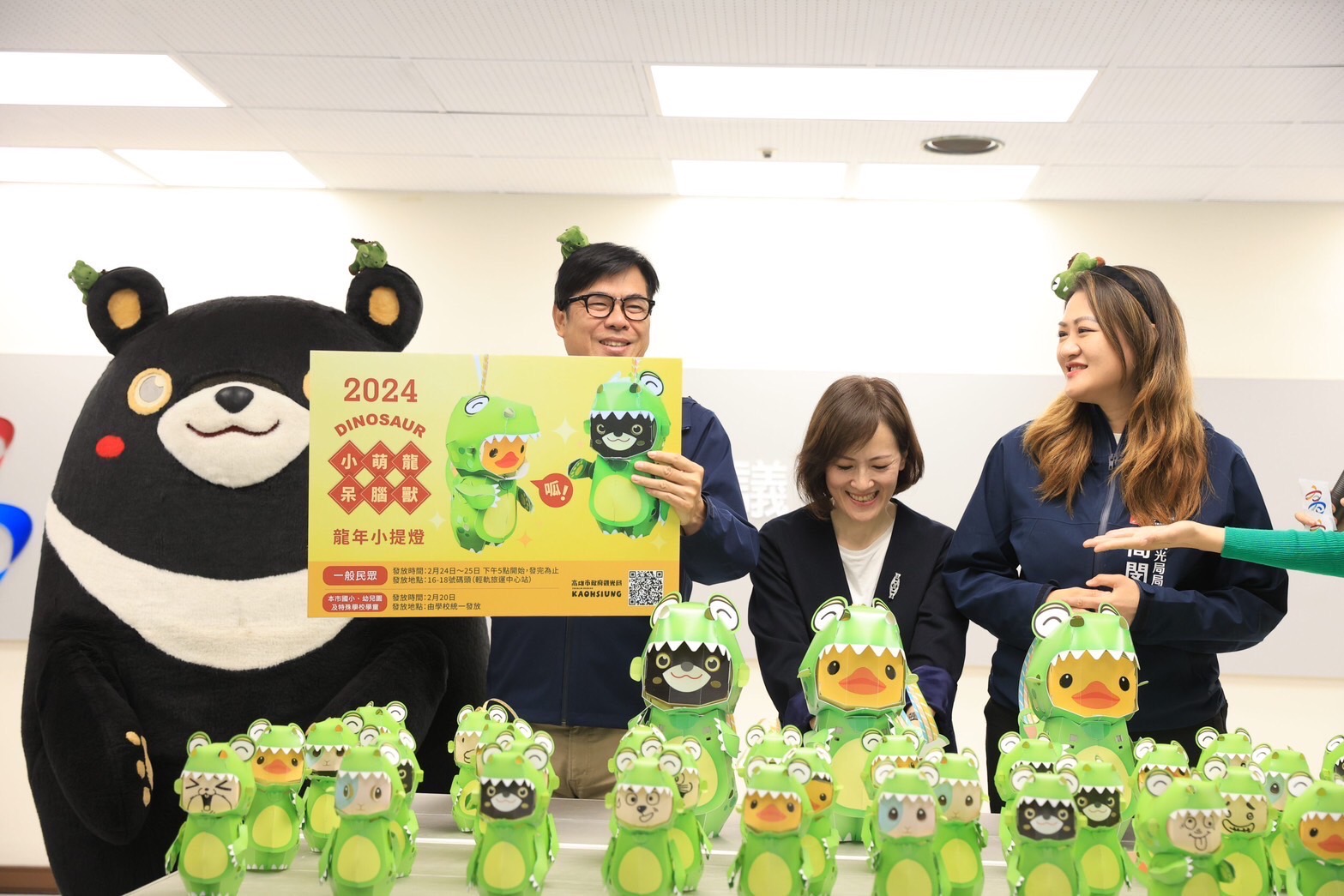 2024高雄燈會主題小提燈「小萌龍呆腦獸(DINOSAUR)」31日正式亮相,高雄市長陳其邁頭戴恐龍造型髮箍,與高雄熊一同介紹龍年小提燈「小萌龍呆腦獸(DINOSAUR)」,並說明小提燈發放方式,高雄市國小、幼兒園及特殊學校學童,2月20日起由學校統一發放,小朋友不用排隊,就能領到1盞龍年小提燈;一般民眾在2月24、25日下午5時,到16-18號碼頭現場排隊領取,一人限領2盞,數量有限,發完為止,讓大小朋友都可以留下美好回憶。