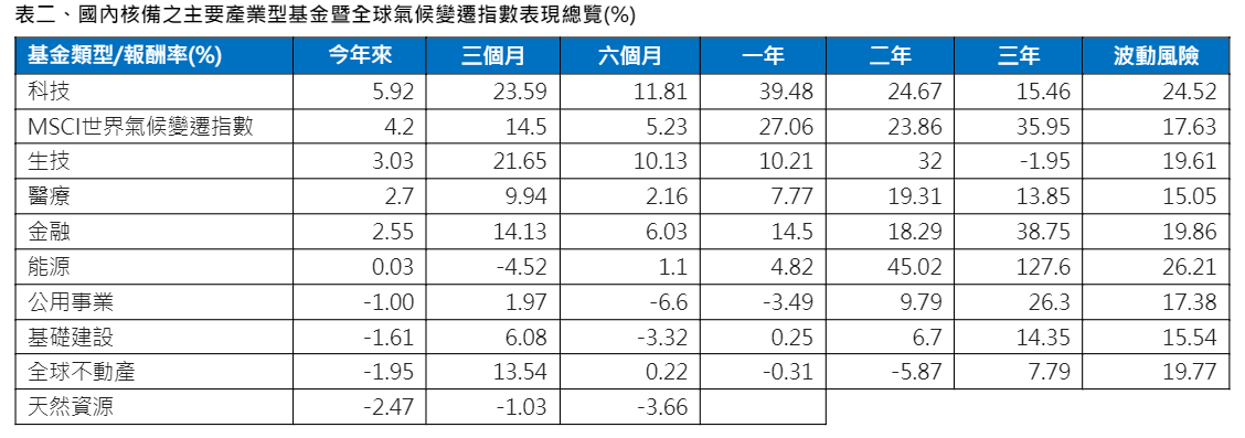 近期Nvidia、AMD、英特爾(Intel)等科技巨頭均在消費性電子展(CES)上釋出最新AI晶片或處理器的訊息,而台積電、美超微電腦(Super Micro Computer)也在AI需求加持下繳出了亮眼業績,讓AI題材繼續延燒,進而帶動1月以來科技型基金上漲5.92%,表現居冠;氣候變遷基金上漲4.2%居次。