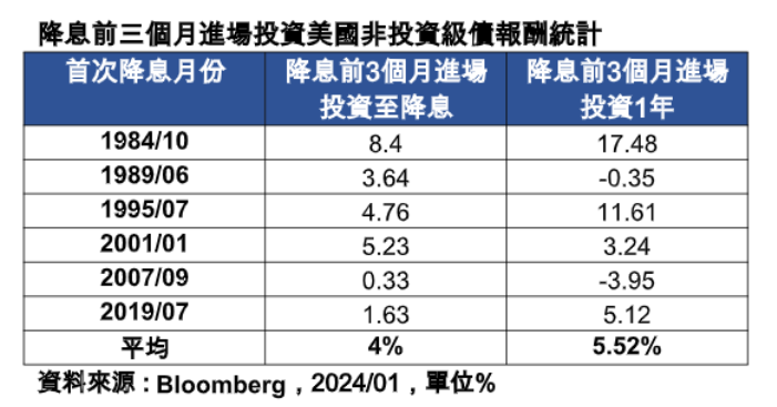 保德信指出,聯準會降息時間預期推遲,預料最快需於5月才有機會見到降息,而根據1984年以來統計顯示,只要在降息前一季進場持有美國非投資級債,持有3個月、1年分別可達到4%、5.5%的表現,顯見目前為卡位美國非投資級債的良好時點。