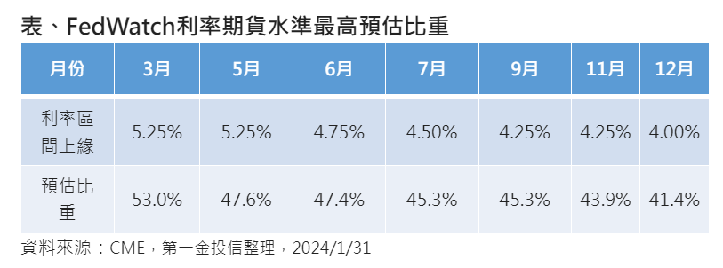從最新FedWatch利率期貨數據觀察,市場預期降息的情境相較去年底,最快3月降息一碼機率降至53%,至年底降息幅度介於3至5碼。聯準會本次聲明,已將升息的選項排除。